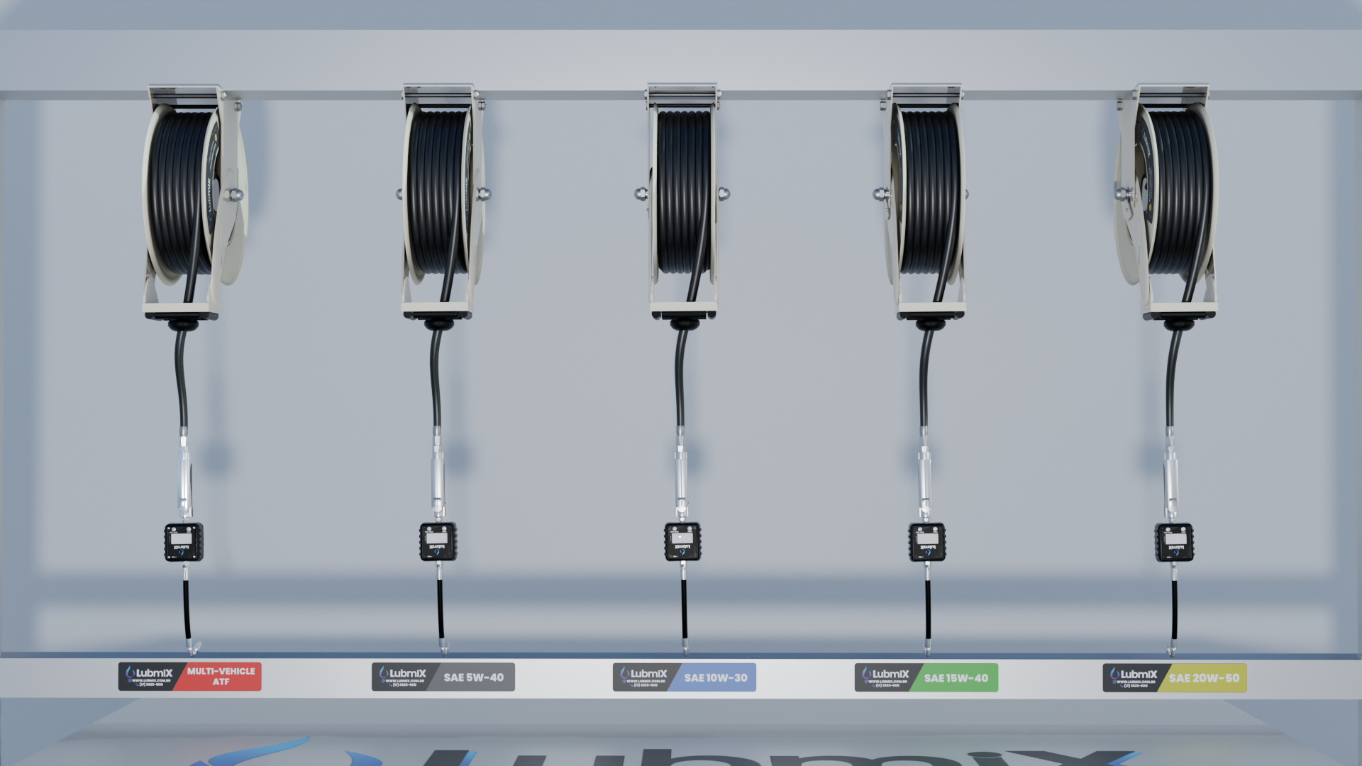 O Carretel Automático Lubmix MIX-1146015M é responsável pela organização e distribuição da mangueira de óleo, garantindo praticidade e segurança durante o abastecimento.